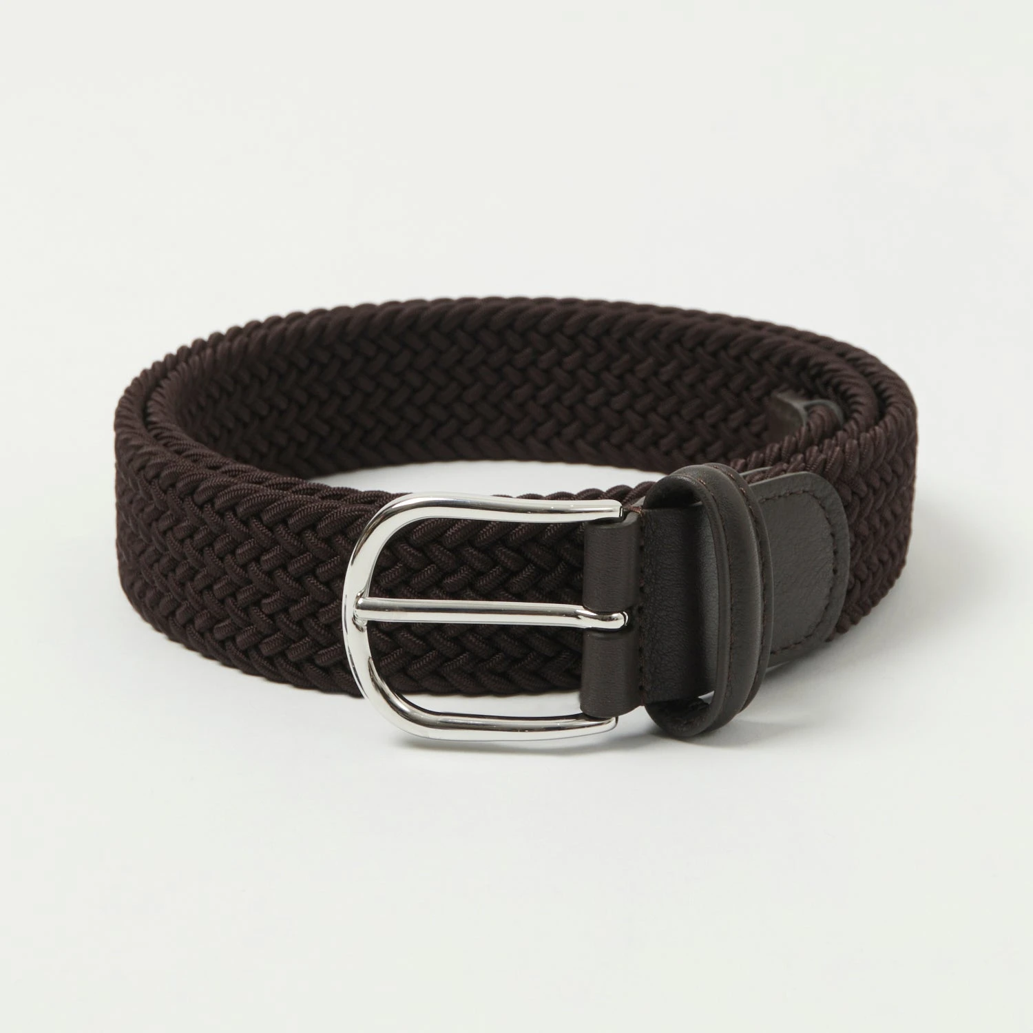 This beautifully hand woven belt is a beautiful new offering from from Italy’s veteran belt makers, Anderson’s. Crafted using a super-durable elastic and nylon cord, this belt allows for functionality and comfort, without sacrificing on style. Leather trims have been added, along with a solid silver metal buckle.