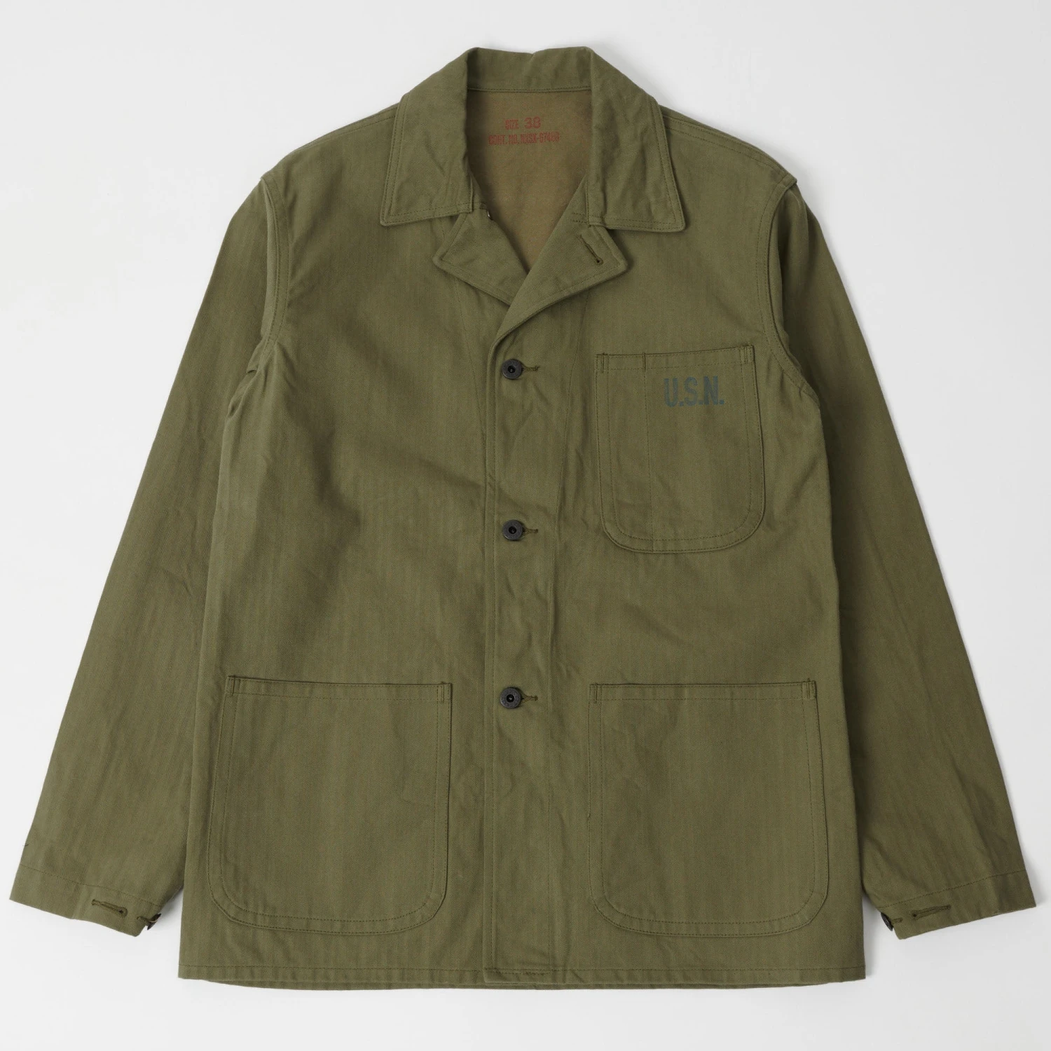 Three front pockets are featured for versatility, and the brand have included traditional donut summarys for the cuffs and front fastening. Two simple stencils are featured to add some heritage authenticity; the one on the left chest pocket reads ‘U.S.N.’, while the red collar stencil details the product size.
