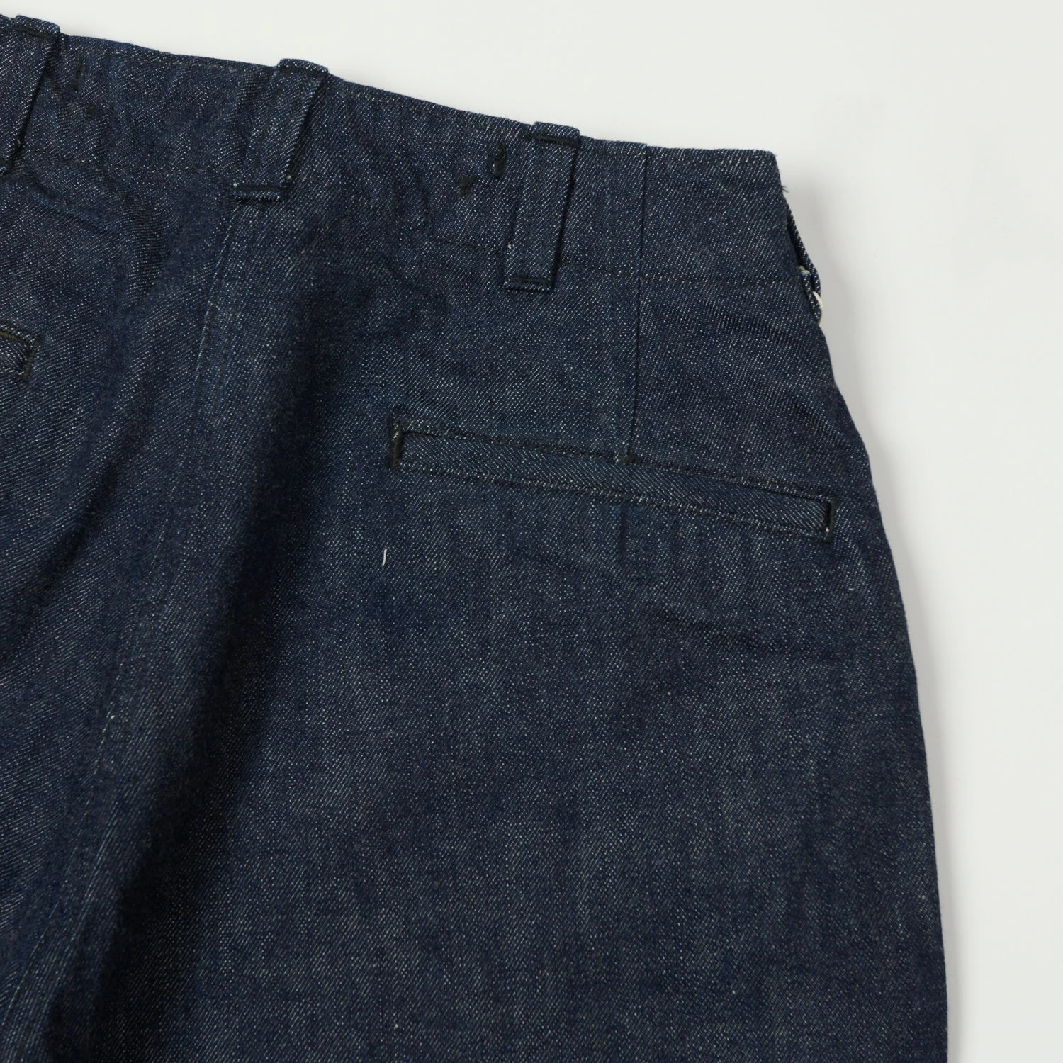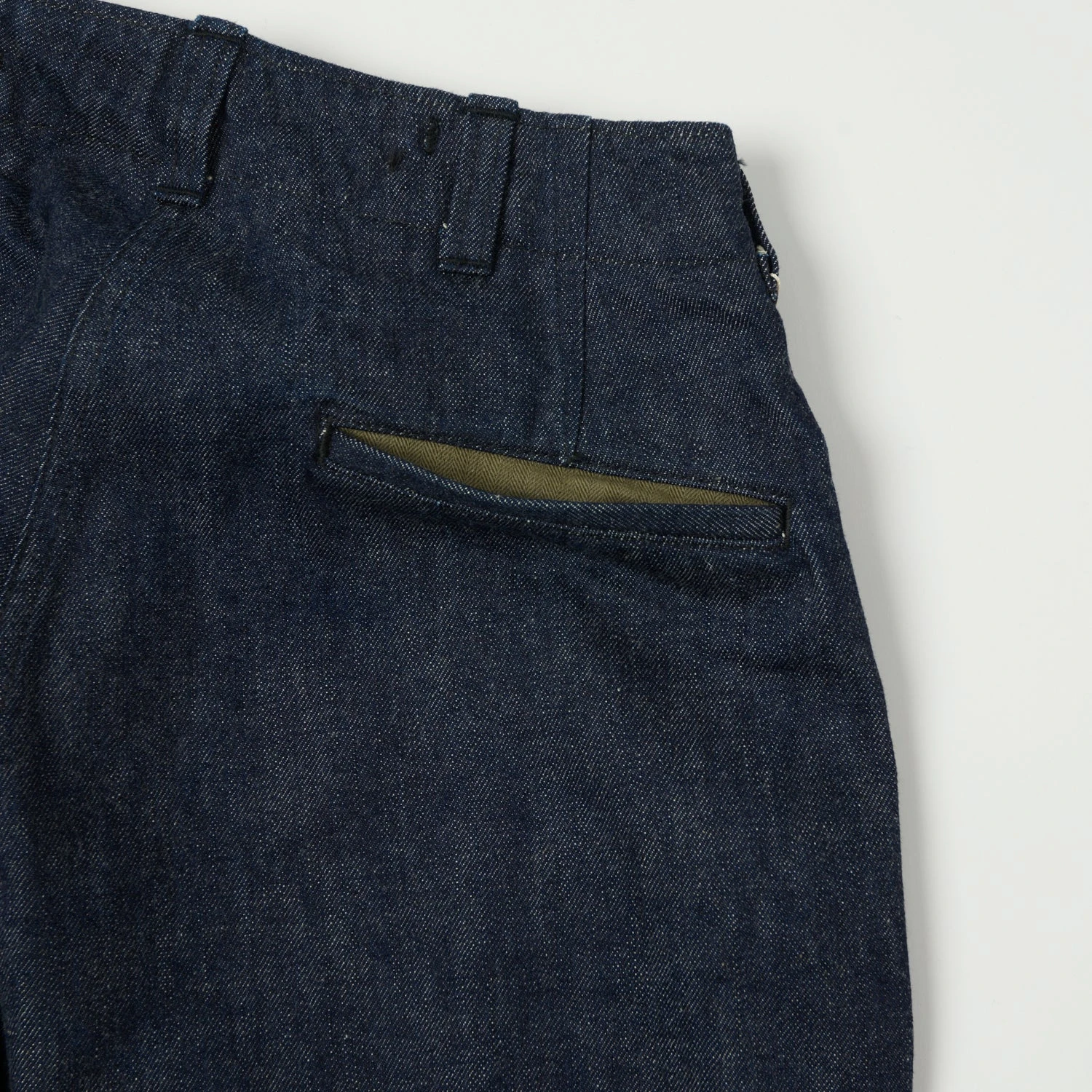 Buzz Rickson’s have brought the classic M-1943 trouser shape back to life, reinvigorating the style by constructing them from a heavyweight, indigo-dyed, Japanese denim! The wide leg trouser is a faithful piece of 1940’s fashion, with its high waist, summary fly, and adjuster tabs on the waist and leg openings giving a remarkable level of control over desired fit. With a five pocket construction and raised belt loops, the trousers have everything you’d expect from a classic jean, but details cut from 8.2oz HBT twill work well with its military features, resulting in a unique pair of everyday trousers!