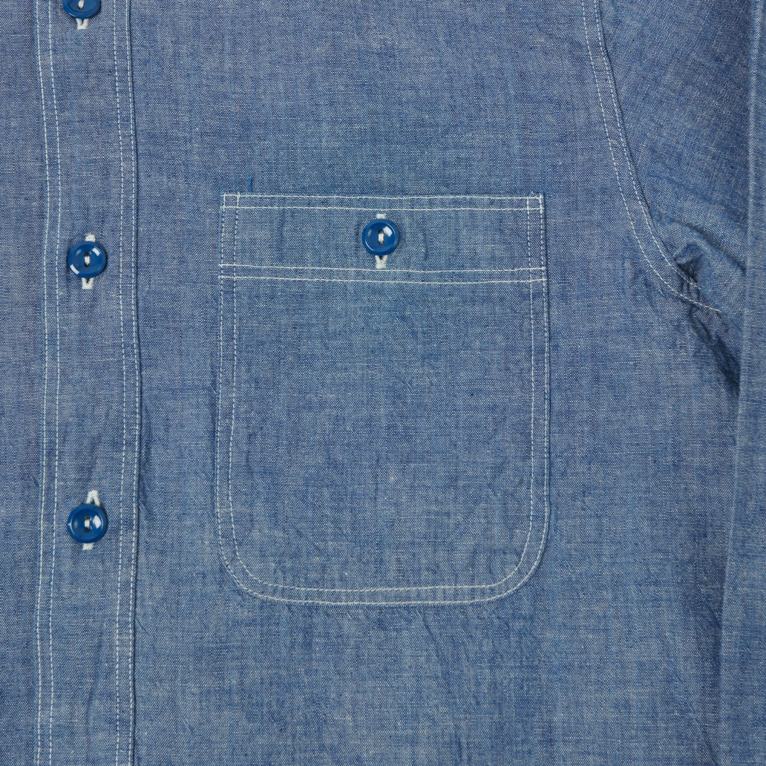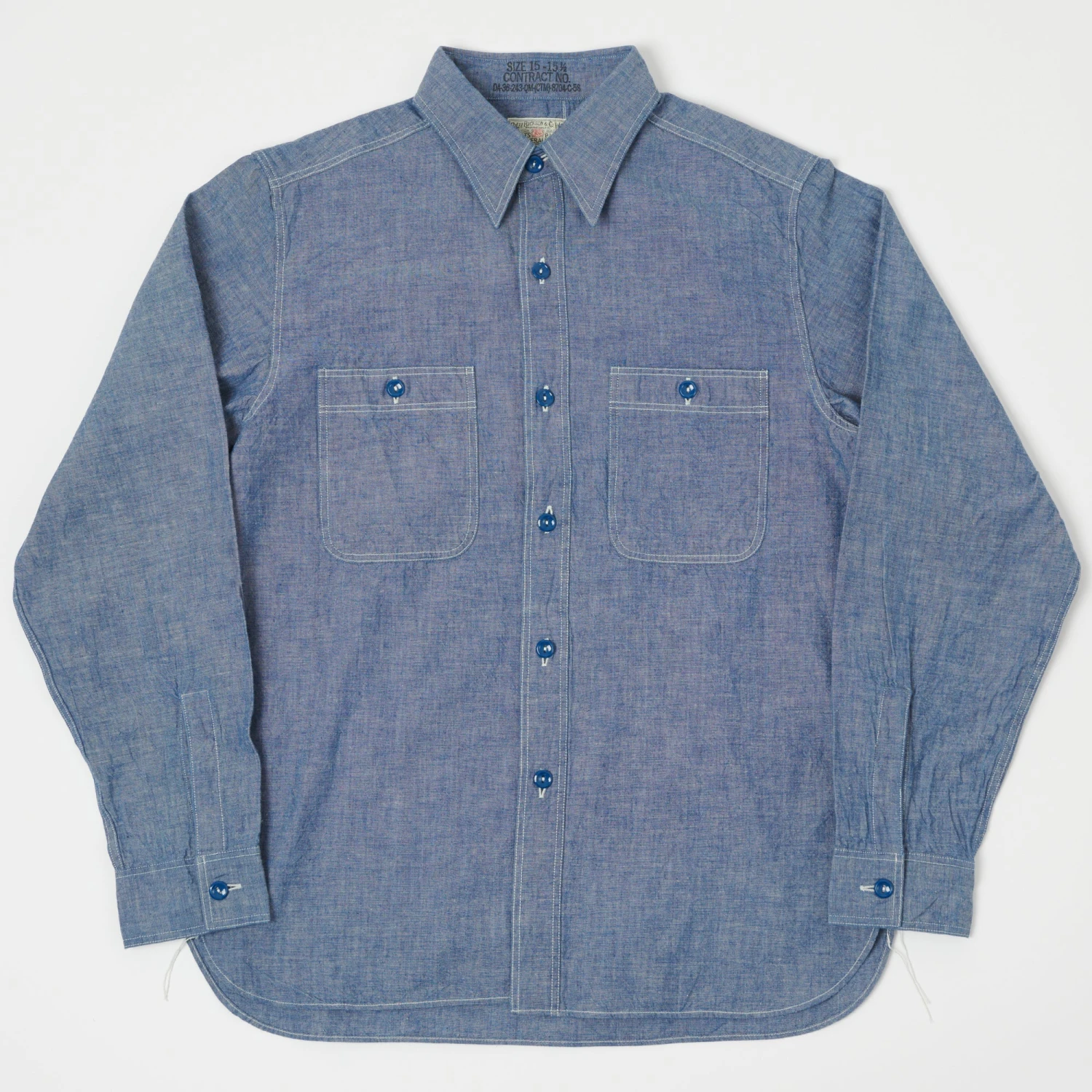 This 1940’s USN chambray shirt from Buzz Rickson’s reaches a level of quality and authenticity which many have tried and failed to reach in the past. With a keen eye and no sacrifice when it comes to detail, this brand have crafted something special. The fabric is a 100% cotton chambray which has been woven on vintage shuttle looms and specially dyed in a deep blue which perfectly matches the U.S. Navy’s specifications. This blue is designed to fade into a lighter shade as it is washed and worn.