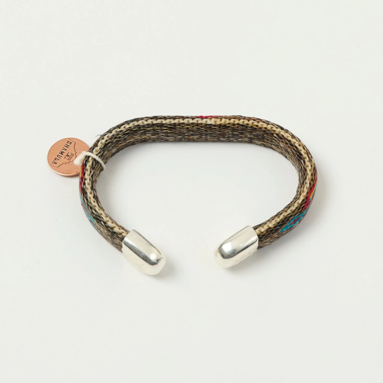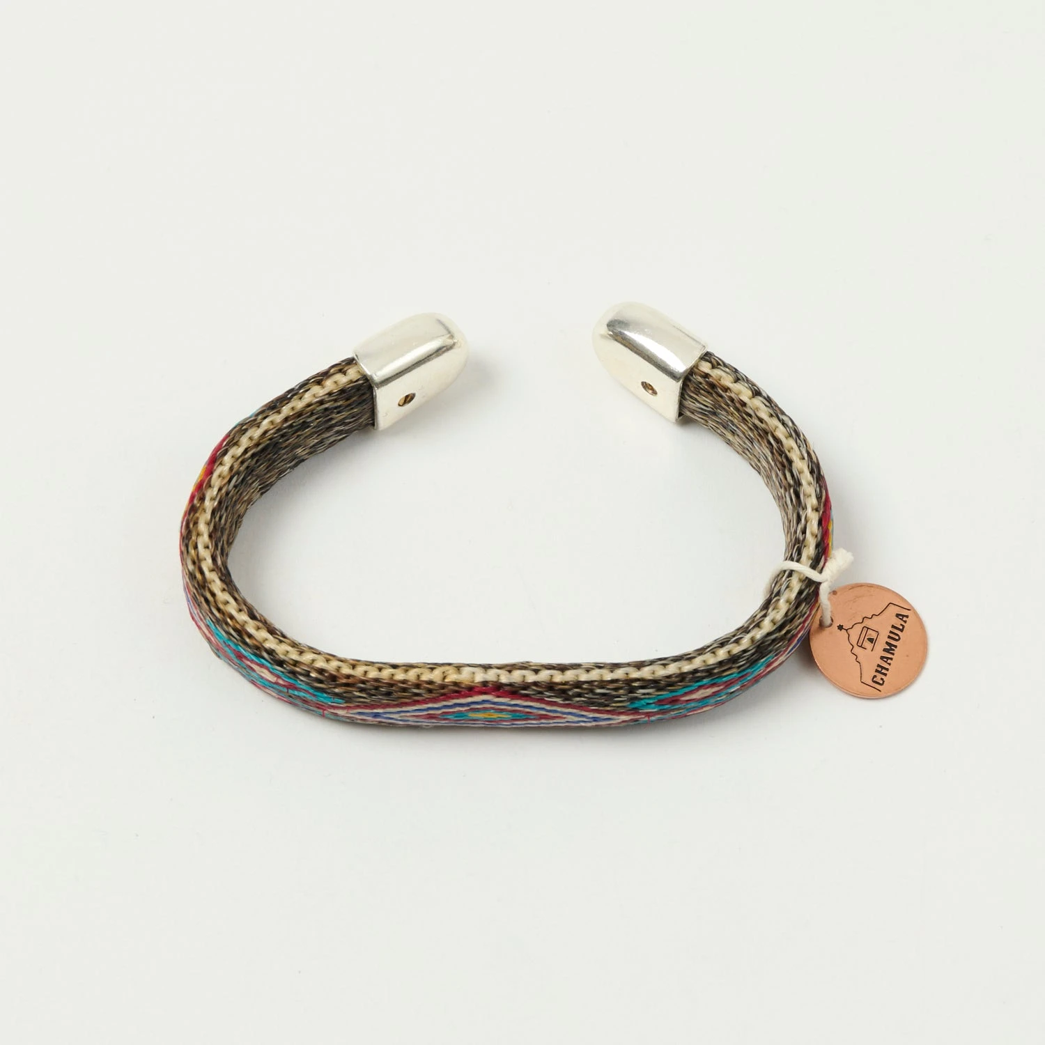 This traditionally woven cuff from Chamula has been crafted using 100% horsehair, and boasts a classic Native American inspired design. It features engraved nickel ends, and can be bent to your correct wrist size for the perfect fit!