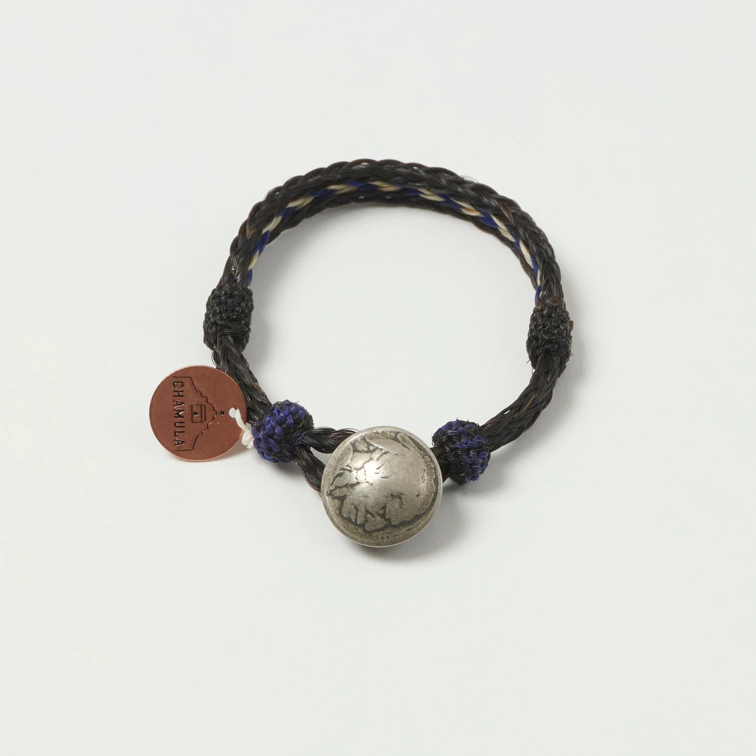 Woven in the traditional style from South America, and using a durable horsehair, this bracelet has plenty of heritage style. This unique piece is fastened with a sliding loop, and boasts a beautifully engraved solid nickel concho.