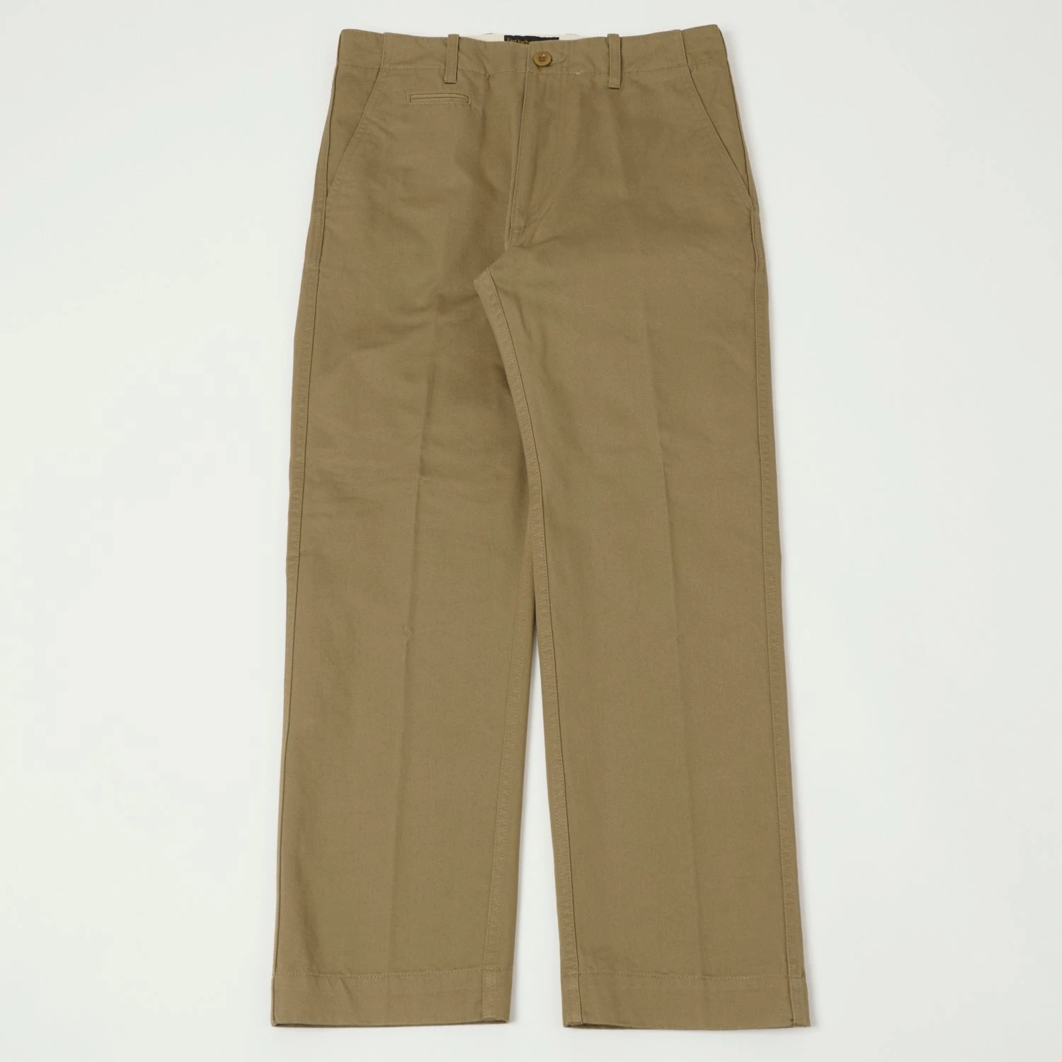 This relaxed silhouette trouser from East Harbour Surplus has been cut from a luxuriously soft, yet durable 100% cotton chino, and boasts traditional detailing, including welted back pockets, side entry front pockets, and flat felled seams throughout.