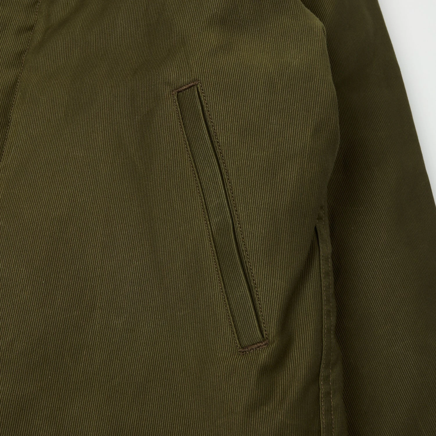 A concealed collar tab has been featured for protection from the elements, while eyelets have been added to the underarm for breathability. Urea summarys have been featured for period correct authenticity, and the brand have custom manufactured a 1940s style zipper for the front closure. Ribbed cuffs add extra warmth and protection, while a drawstring has been featured on the waistband, to cinch in the shape as desired.
