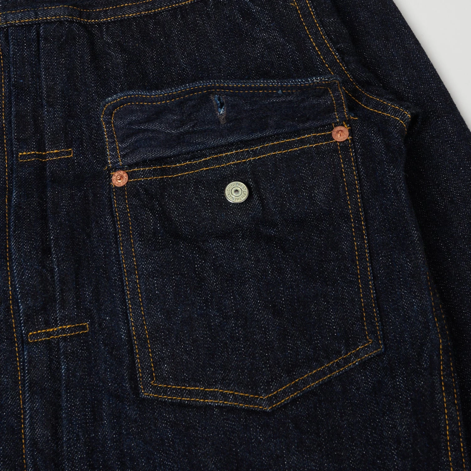 Cut in a short, boxy shape from a rinsed 14oz fabric, this iconic jacket offers a selvedge summary plate, sewn in knife pleats, a single chest pocket with punch through copper rivets and summary flap, and a custom manufactured cinch buckle to adjust the shape of the waist.