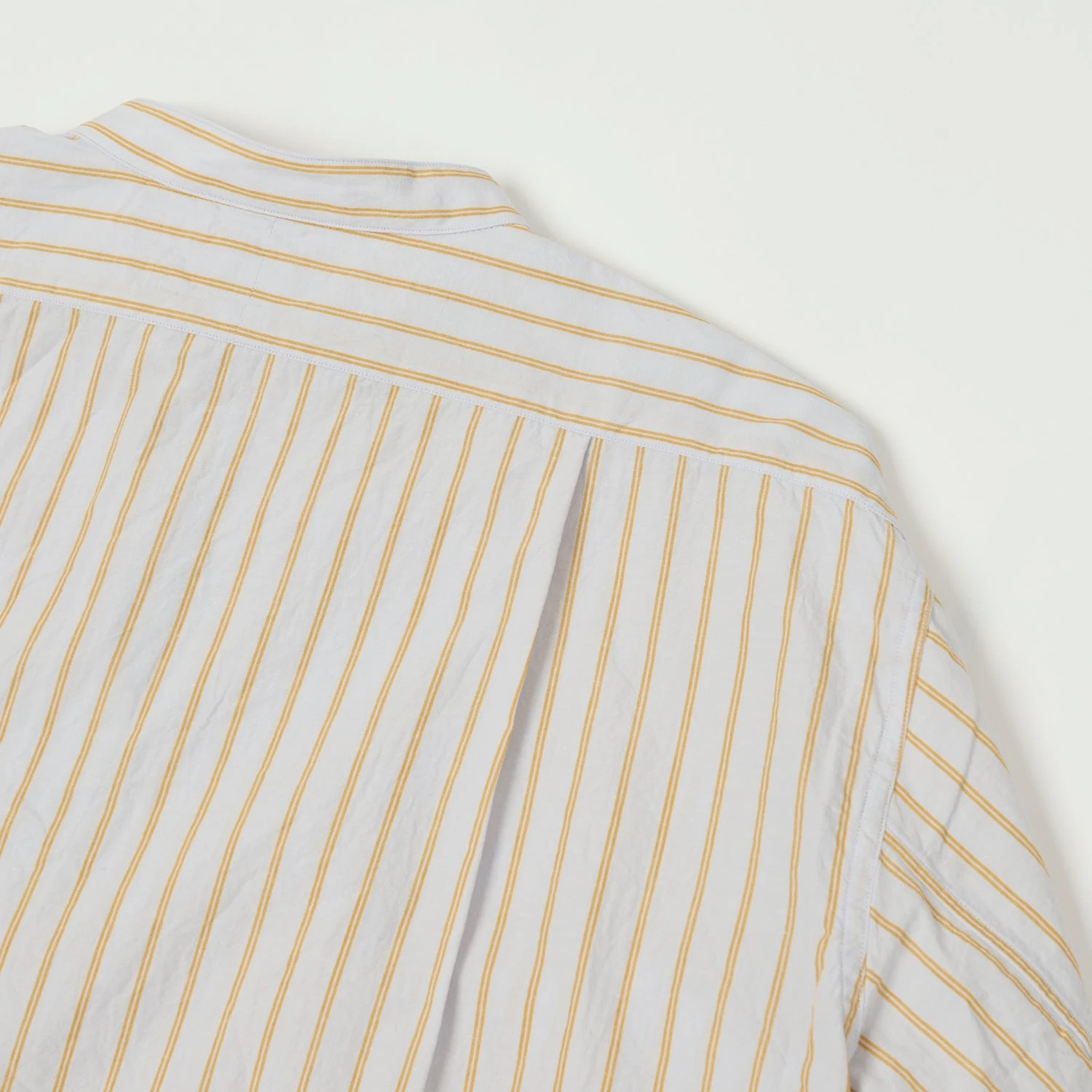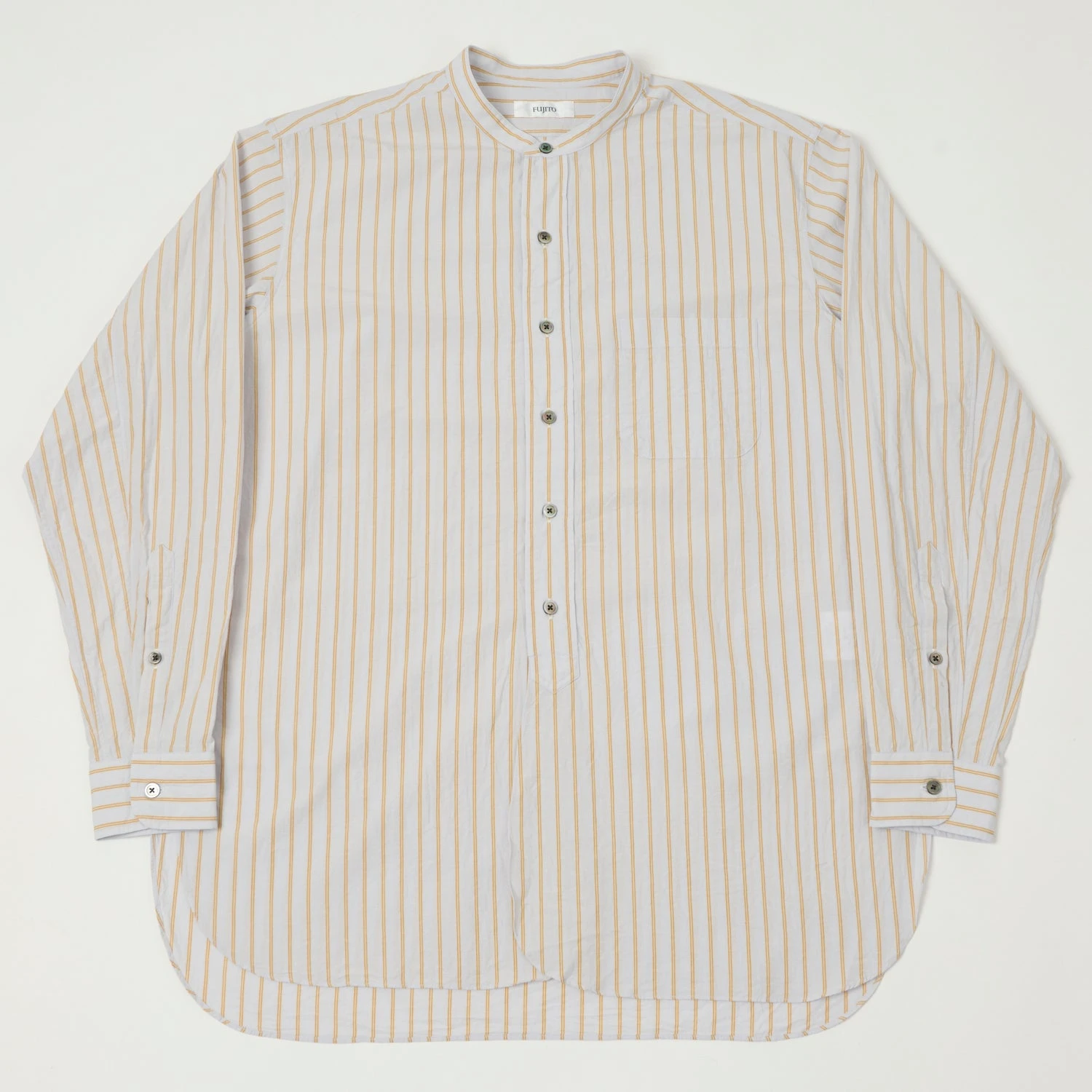 Fujito’s Officer Shirt is a fantastic addition to any summer wardrobe, with its Cotton/Linen construction offering airiness and a relaxed silhouette. A front placket is applied down 2/3 of the closure, and pearlescent summarys add a pop of colour and texture. Buttoned cuffs and a single chest pockets are applied as you’d expect, and a ‘grandad’ collar sets the shirt apart from the rest.