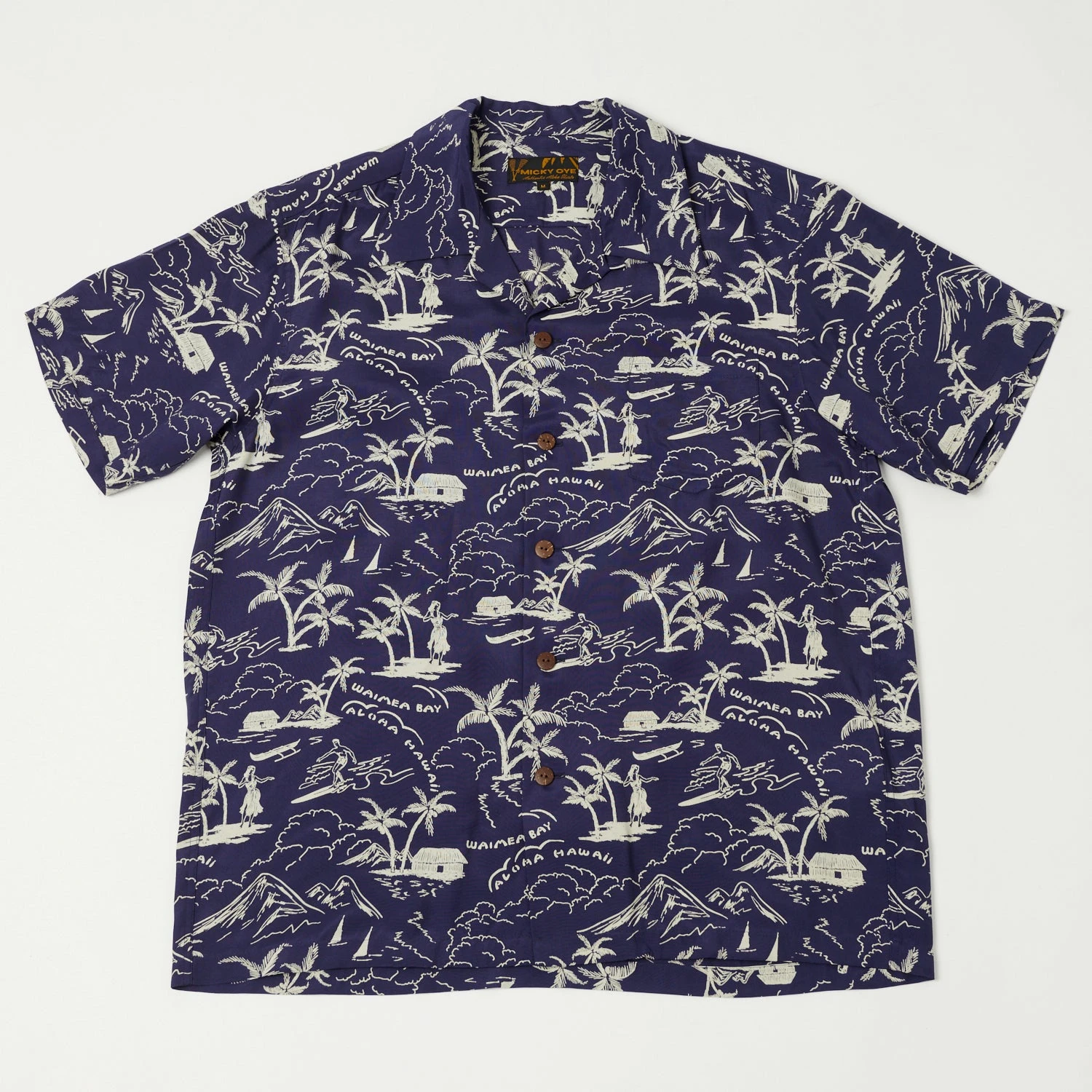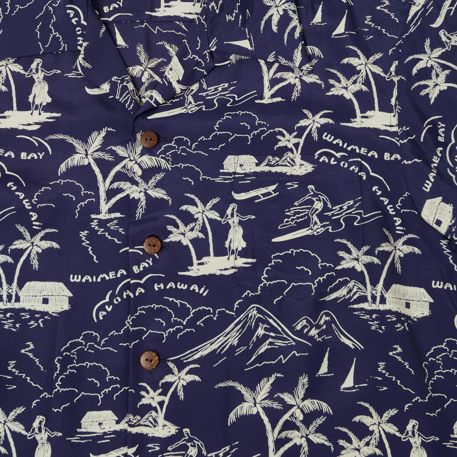 The Waimea Bay shirt depicts, in traditional style, the coastal life in the bay area, on the North Shore of Oahu. This option is more subtle than the others in the collection, but still packs a lot of punch, and offers a great way to throw a touch of interest into any casual outfit.