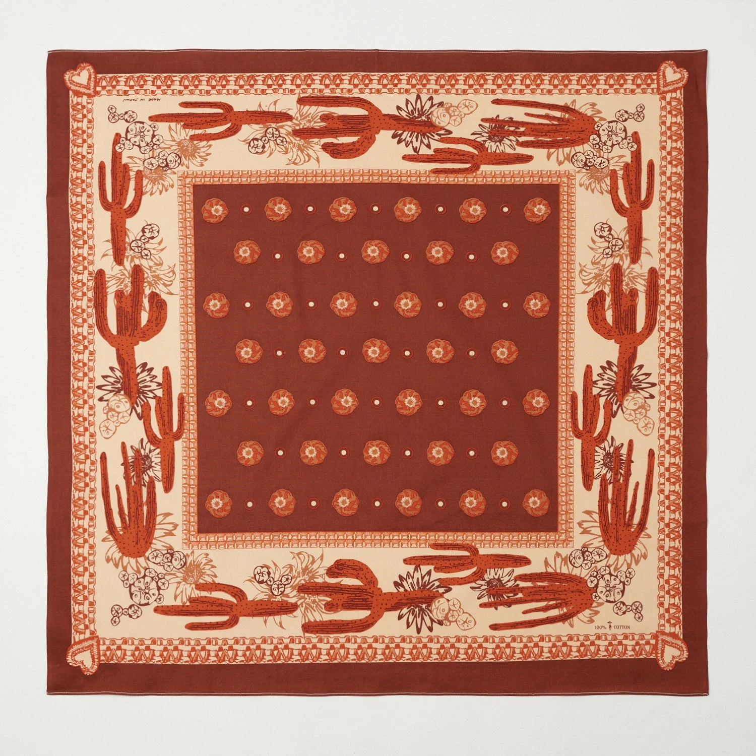 Inspired by the psychedelic plant culture of the American south-west, this cactus ridden design overs a rich, and vivid rust colour at its base, which plays off brilliantly with the natural lighter tones. This versatile larger size bandana is cut at 90×90 cms, and can easily be used as a headscarf, shawl, carry wrap, or traditional Japanese way to wrap gifts.