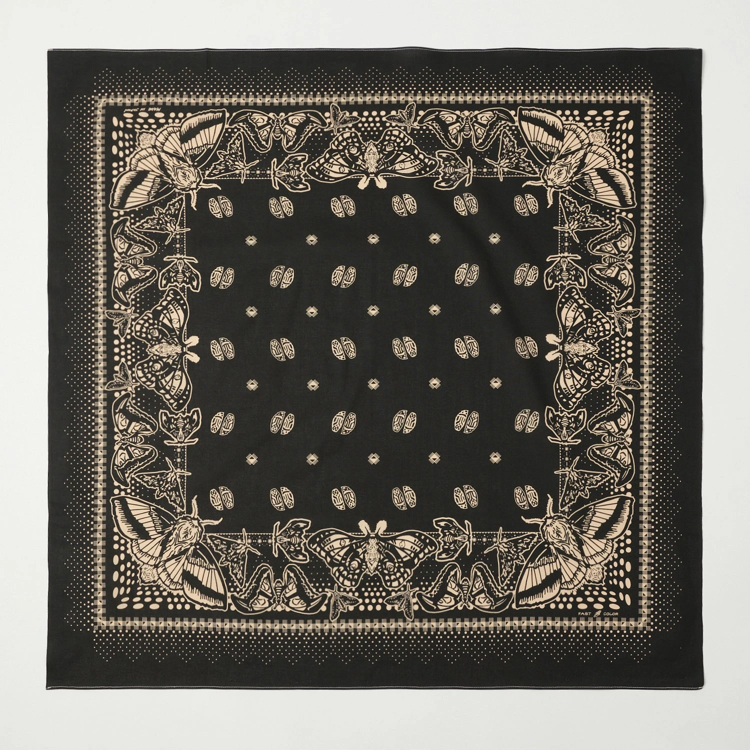 The bold moth design on this bandana has been beautifully illustrated, while a deep black colour option allows this offering to blend into almost any outfit. This versatile larger size bandana is cut at 90×90 cms, and can easily be used as a headscarf, shawl, carry wrap, or traditional Japanese way to wrap gifts.