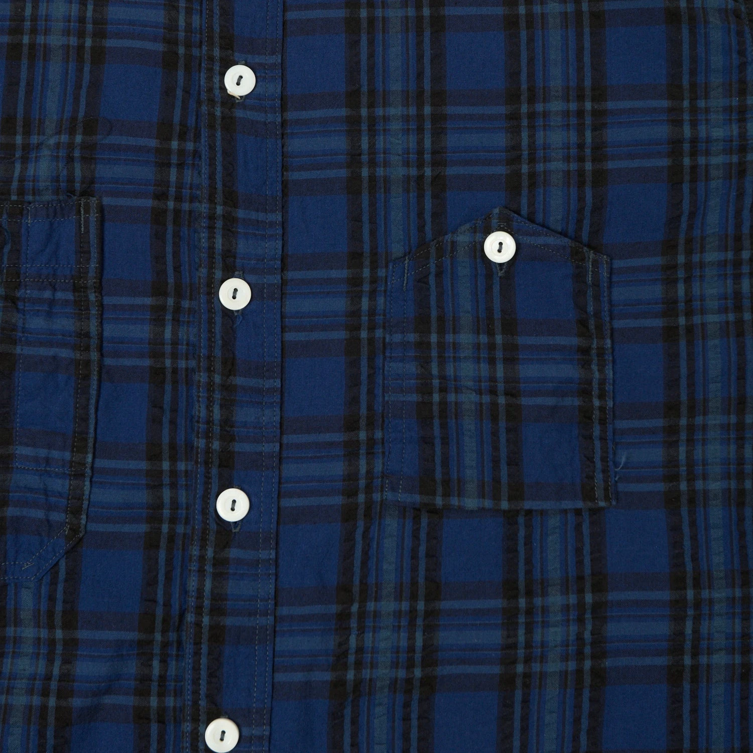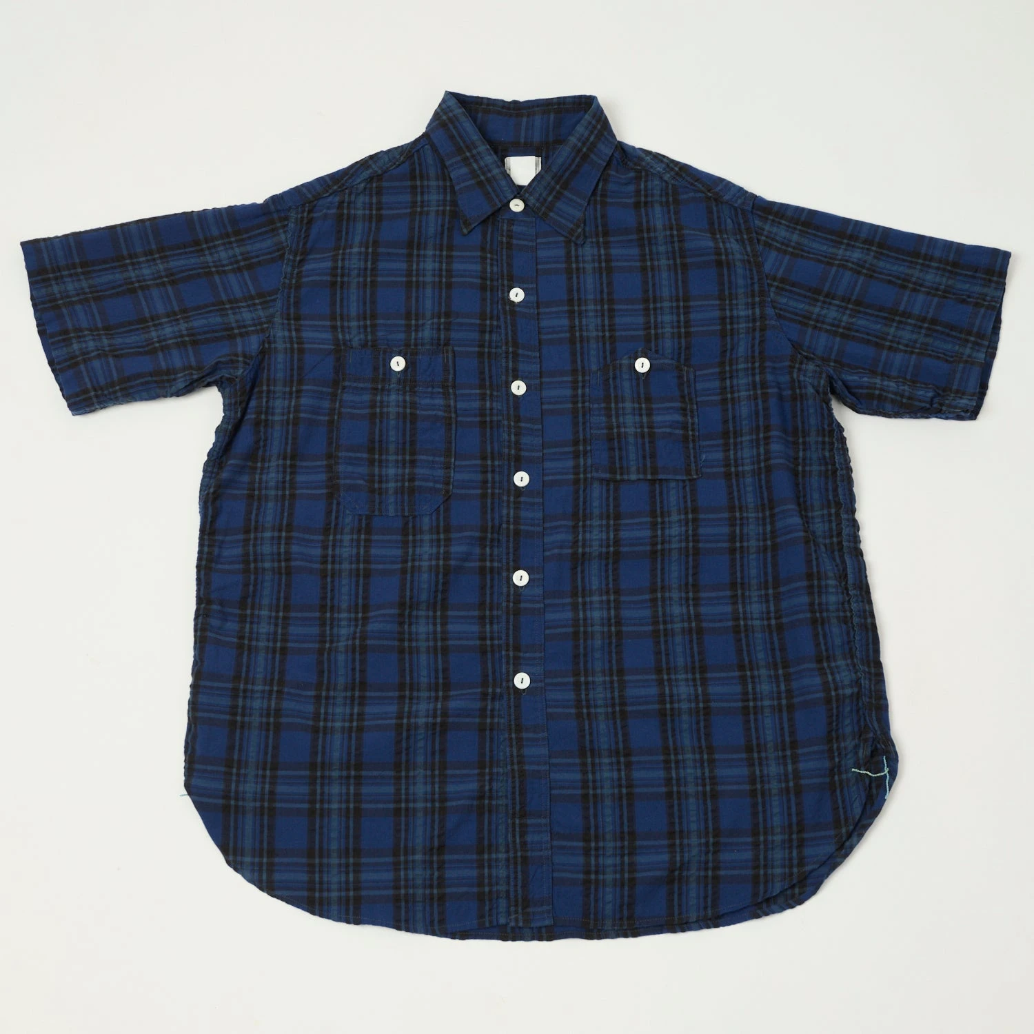 Post Overalls ‘Number 6’ Shirt has been a staple of the brands collection since it was introduced in the mid-90s, and the short sleeve version is a perfect way to bring this classic with you into summer. Cut from a lightweight, Japanese plaid seersucker cloth, the shirt is inspired directly by vintage railroad gear, featuring two asymmetrical summaryed chest pockets and a pointed collar. A front summary closure is in place, and reinforced side gussets with run-offs, as well as custom woven brand labels, stand as a mark of quality assurance.
