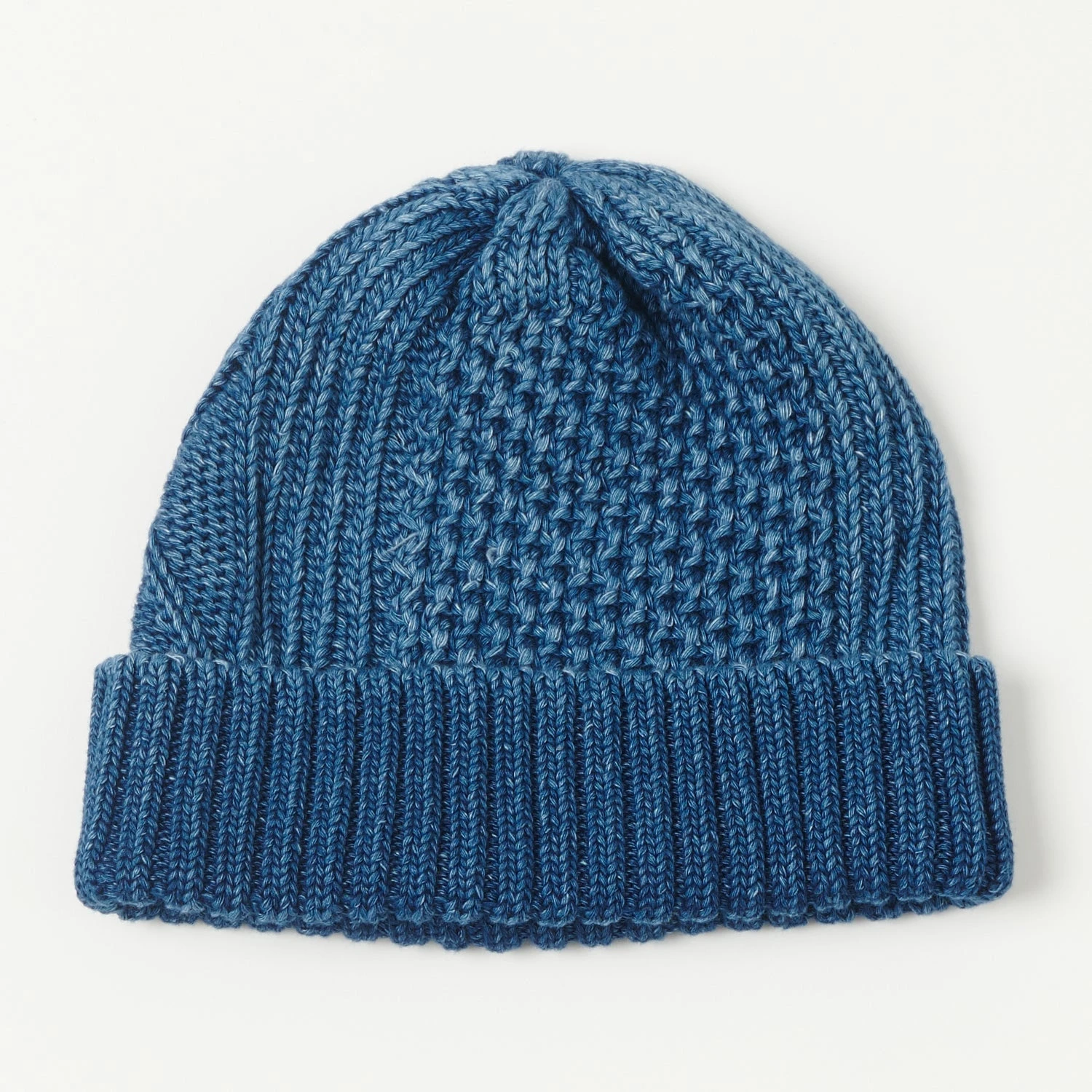 This all cotton watch cap has been woven in the traditional Aran pattern, and the brand have given the piece a light bath in some beautiful indigo dye. With one built in roll, the cap fits small on the head, and moulds into shape effortlessly, thanks to the quality of the materials used.