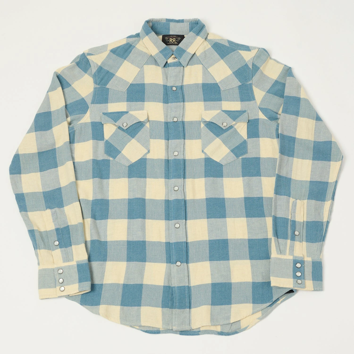 Inspired by the western shirts of the 1950s, RRL’s faithful take on this classic is a slim-fitting shirt cut from lightweight indigo-dyed plaid linen-cotton twill. The heavily washed appearance enhances its vintage look. Features include a straight collar with a metal summary, a summaryed placket, double snap chest pockets, and barrel cuffs.