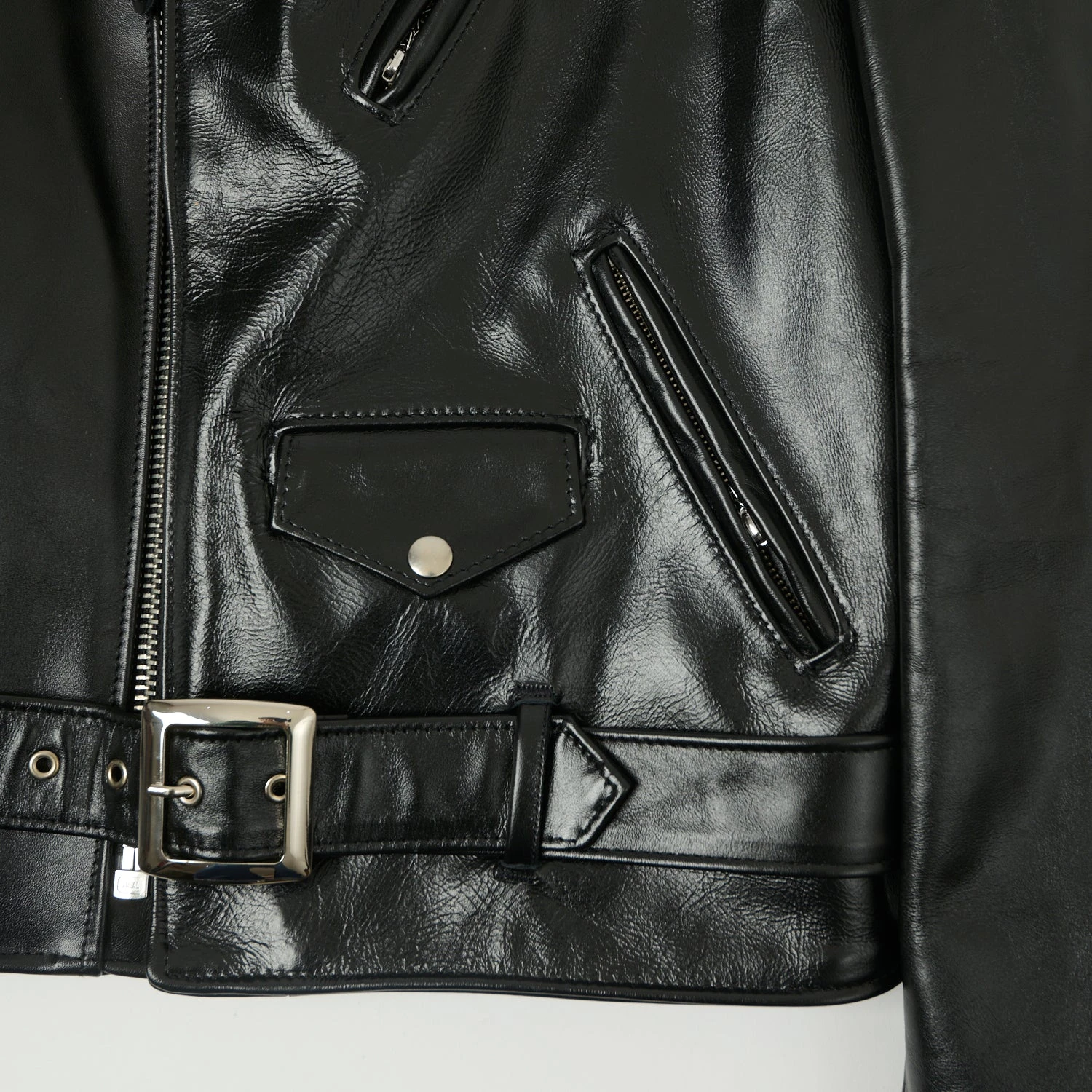 Cut from a heavyweight horsehide leather, the jacket boasts a large back panel, asymmetrical front zipper pattern, and snap down lapels with Schott’s classic one-star hardware. The traditional zipper cuffs and an attached half belt with heavyweight nickel plated buckle provide a good fit, three outside zip pockets and one inside pocket allow easy storage, and a quilt nylon lining and water resistant leather finish protect against the elements.