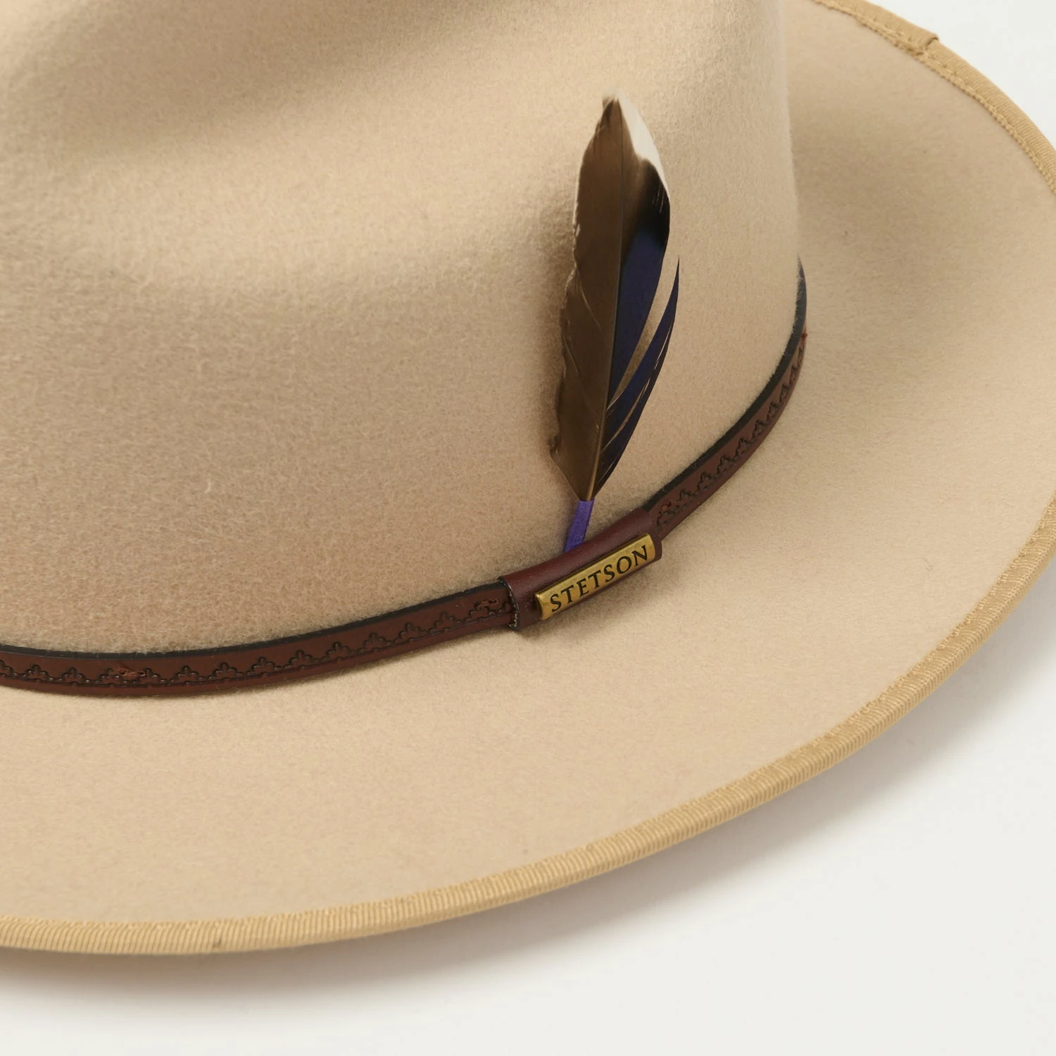 Made of a hardened 100% Wool, Stetson calls back to the glory days of the American west with their Open Road hat. With a hardened brim and feather to adorn the side, this hat is perfect to tie together western and bohemian outfits!