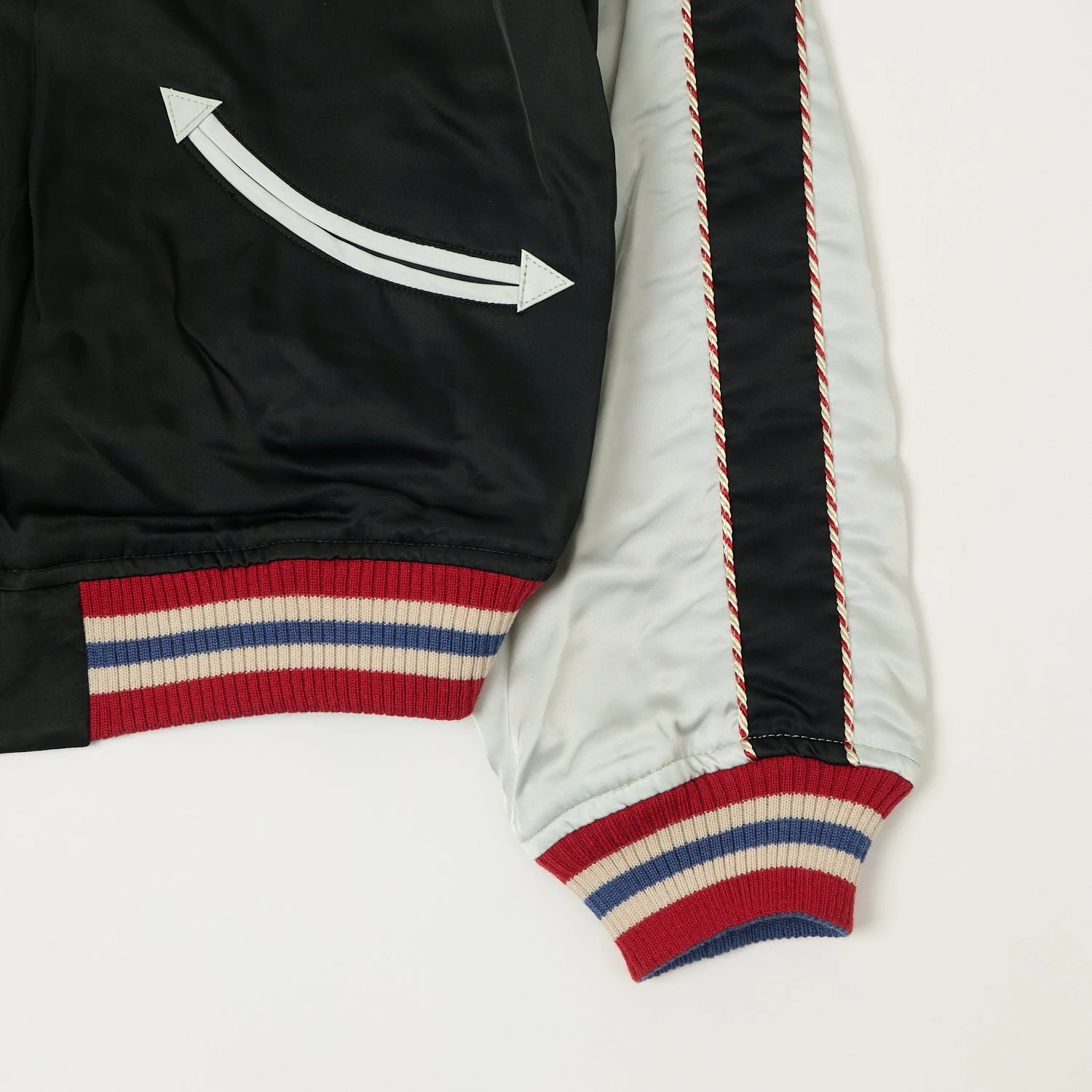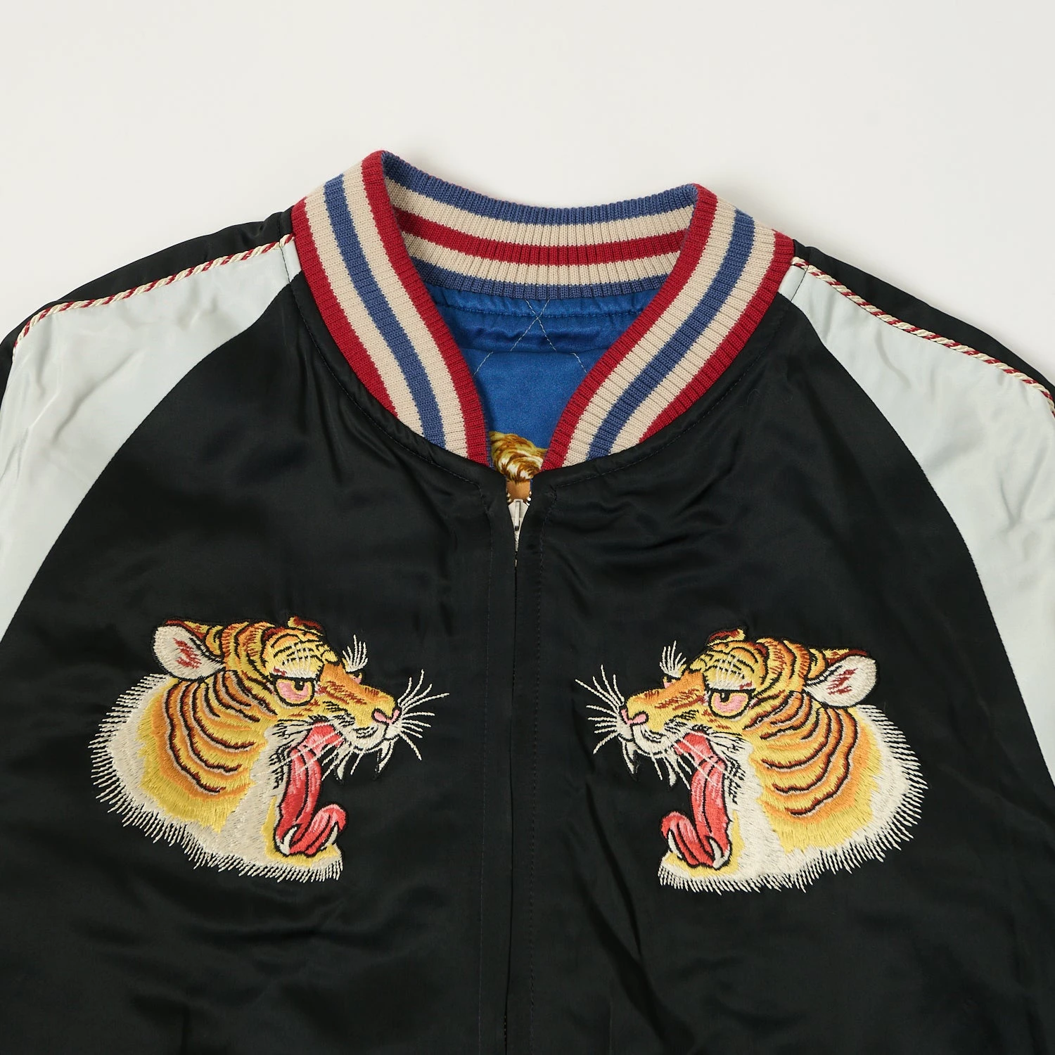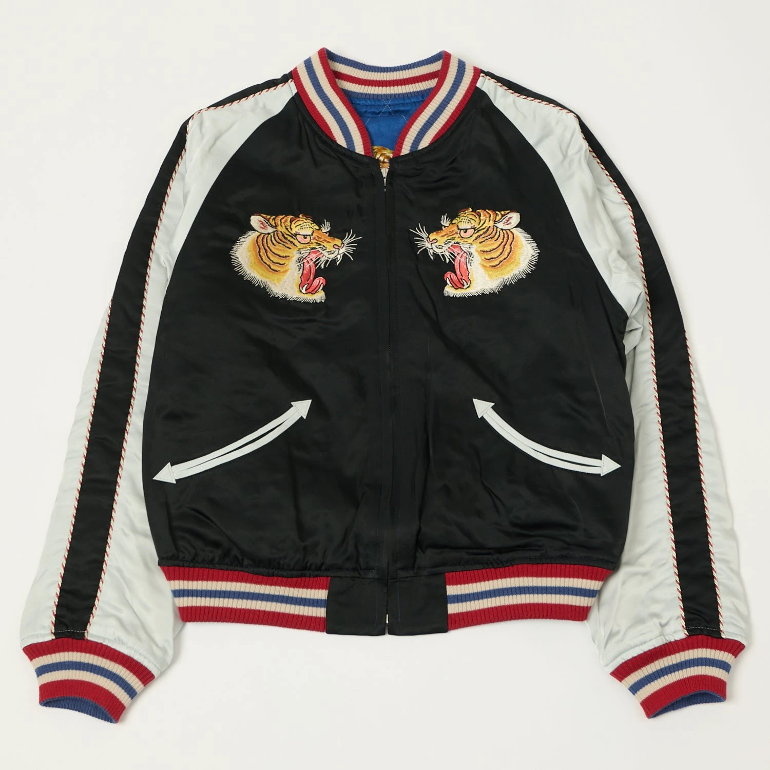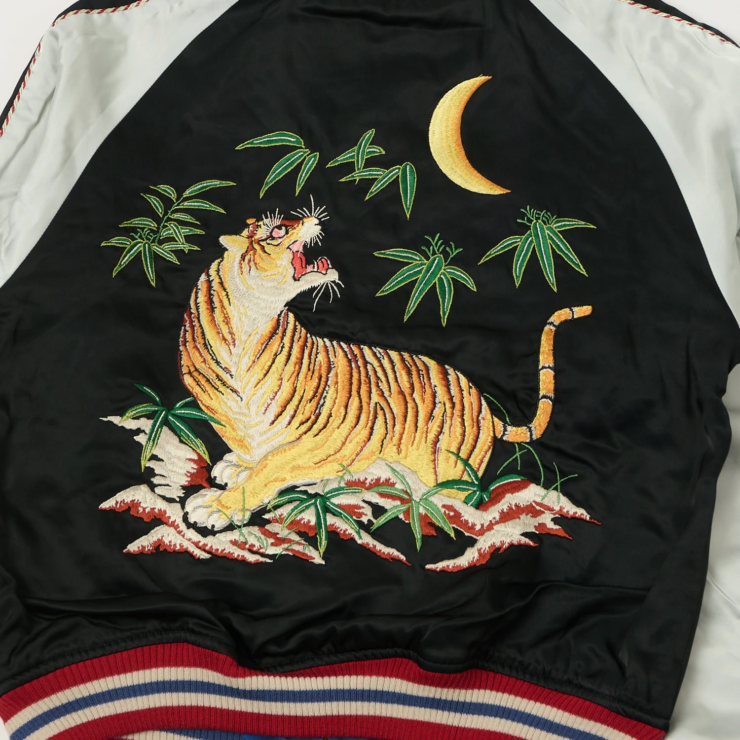 The reverse of the jacket features more traditional souvenir iconography. On the back is an intricately embroidered tiger, growling at the moon, and on the chest we have the tiger’s snarling head. Both sides feature piping on the arms and red, white and blue ribbed detailing on the cuffs and hem.