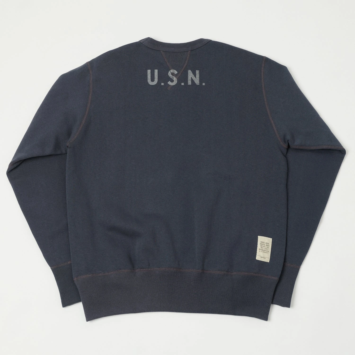 This sweat is a regular fit, with a tight waistband which allows for a slightly slouchy feel, while knitted cuffs and waistband ensure the perfect comfort fit. A mid-century ‘double v’ insert has been added to the collar detail, for a touch of heritage authenticity, and a vintage factory style care label sits just above the waistband. For an added touch of military authenticity, the brand have included the iconic ‘U.S.N.’ stencil on the back of the collar, a subtle detail which stands this option out from others on the market.