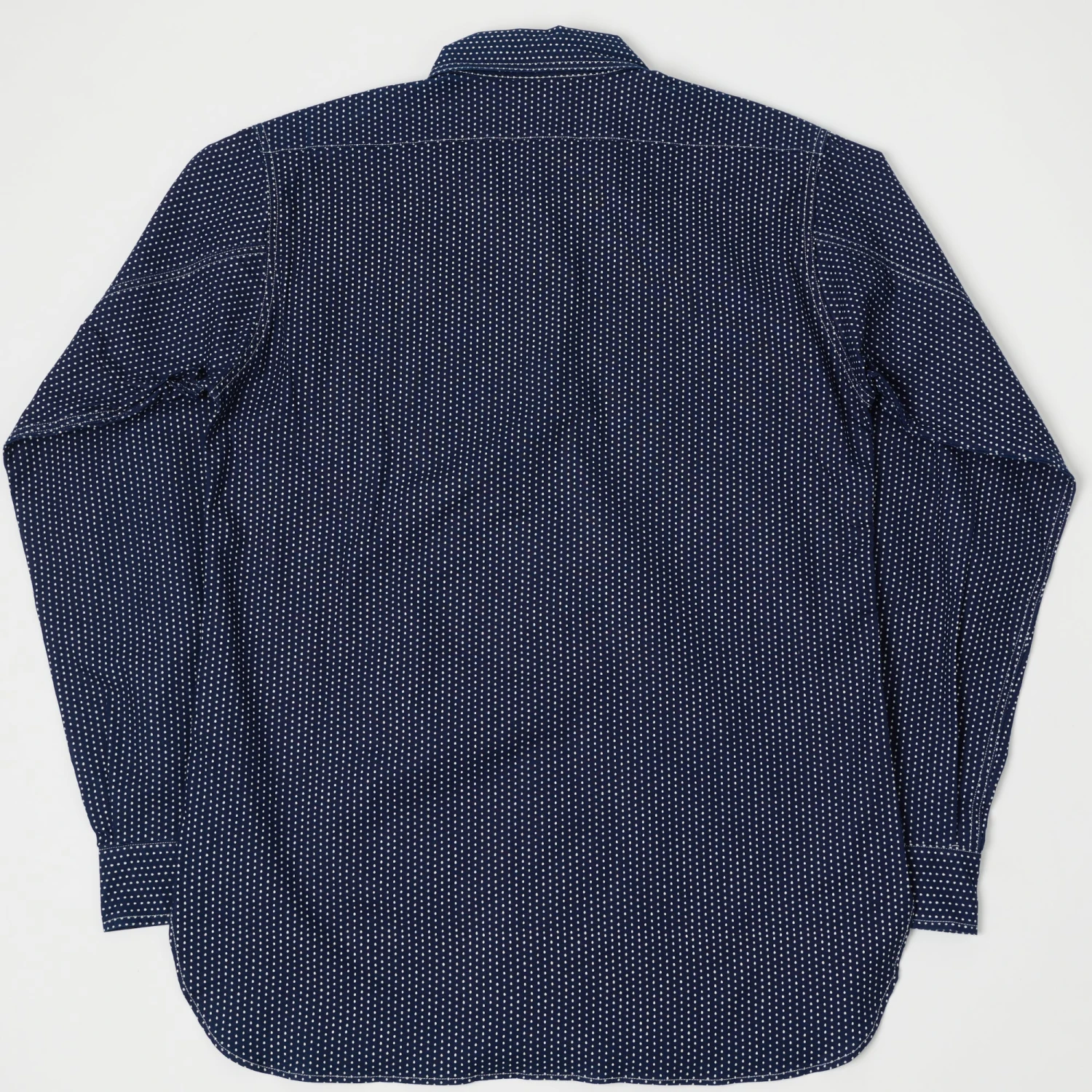 Brand new from Warehouse & Co is this indigo masterpiece. With a cassic/regular fit, this shirt’s beauty lies in its nuanced details. It features a hidden summary down on the collar and a crossover tab for an authentic heritage feel. Two patch pockets adorn the chest, putting this shirt in the casual catagory. The real beauty is the fabric. The incredible ‘indigo dot’ pattern is perfectly symmetrical and yet unmistakenly hand printed at the same time. It is eye catching without being overpowering. A great addition to the wardrobe of any indigo enthuseast.
