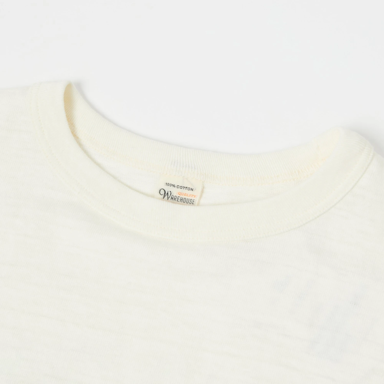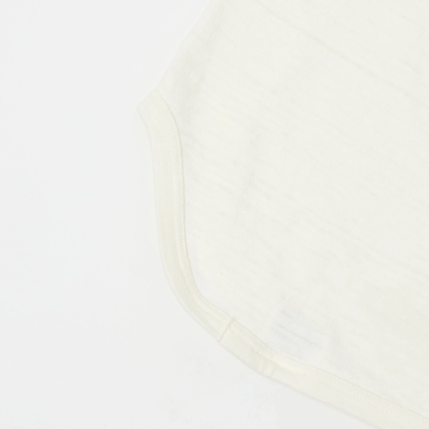 The sleeves are set in and are a 3/4 length for that classic mid century baseball feel, while the shoulder has been slightly dropped which enhances the relaxed fit of this model. The tee is made from 100% cotton and was woven on a tubular knit which means that there are no side seams for added comfort and the assurance that it won’t twist in the wash.