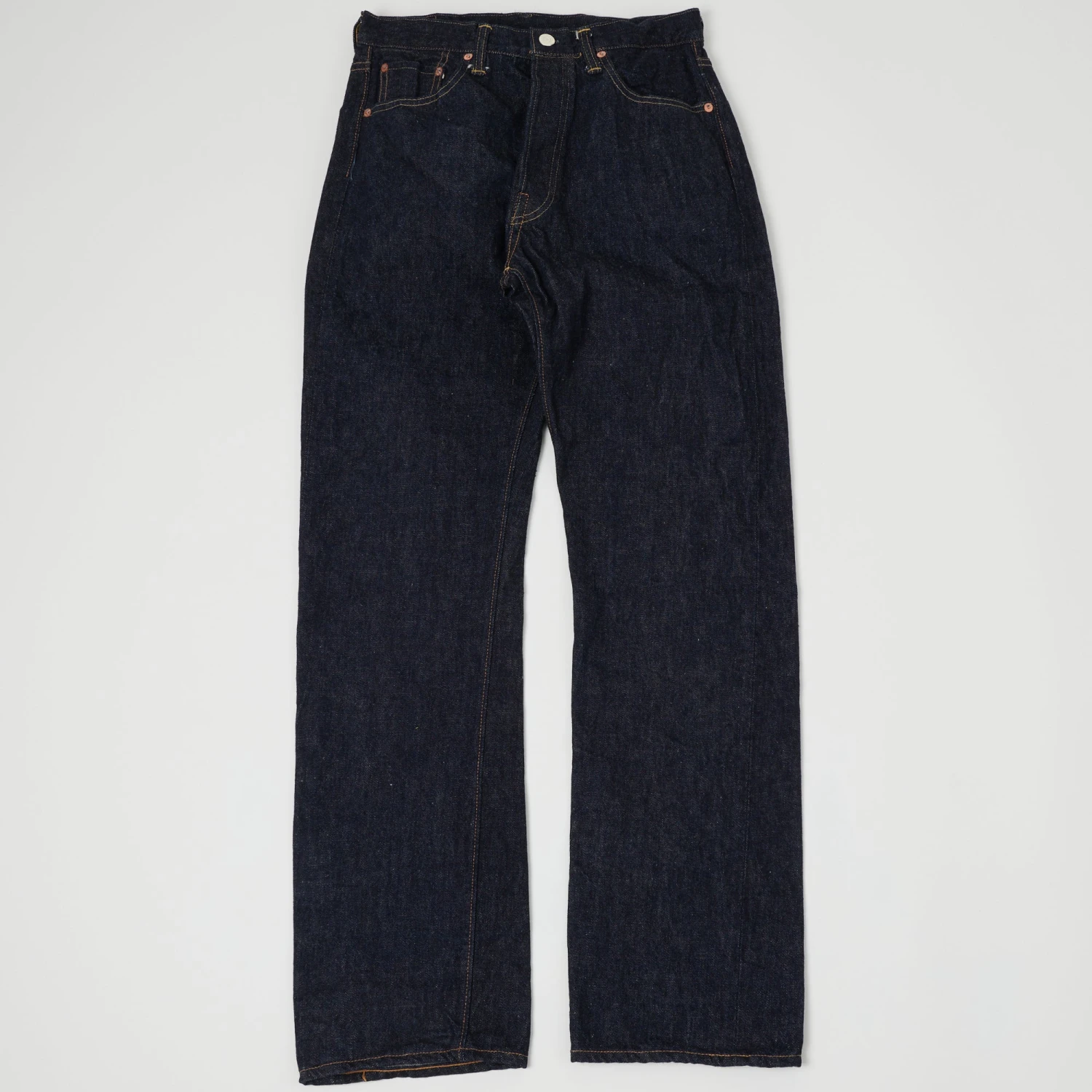 They boast a summary fly with custom branded summarys, and punch through copper rivets throughout, including concealed rivets on the rear pockets. The 13.5oz denim is expertly woven and produces brilliant fades over time through its deep indigo blues, whilst softening and fitting you better wear on wear. The deer skin leather patch holds the brand’s traditional logo and the yellow selvedge line is a stamp of Warehouse’s authenticity.