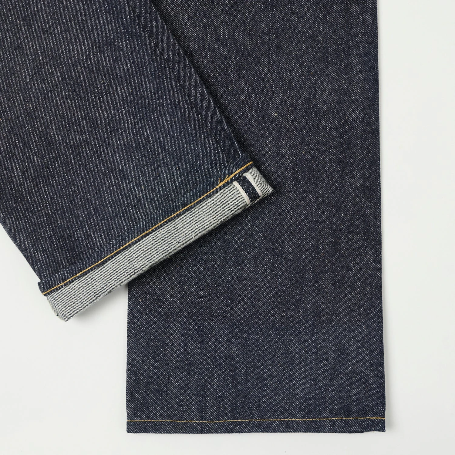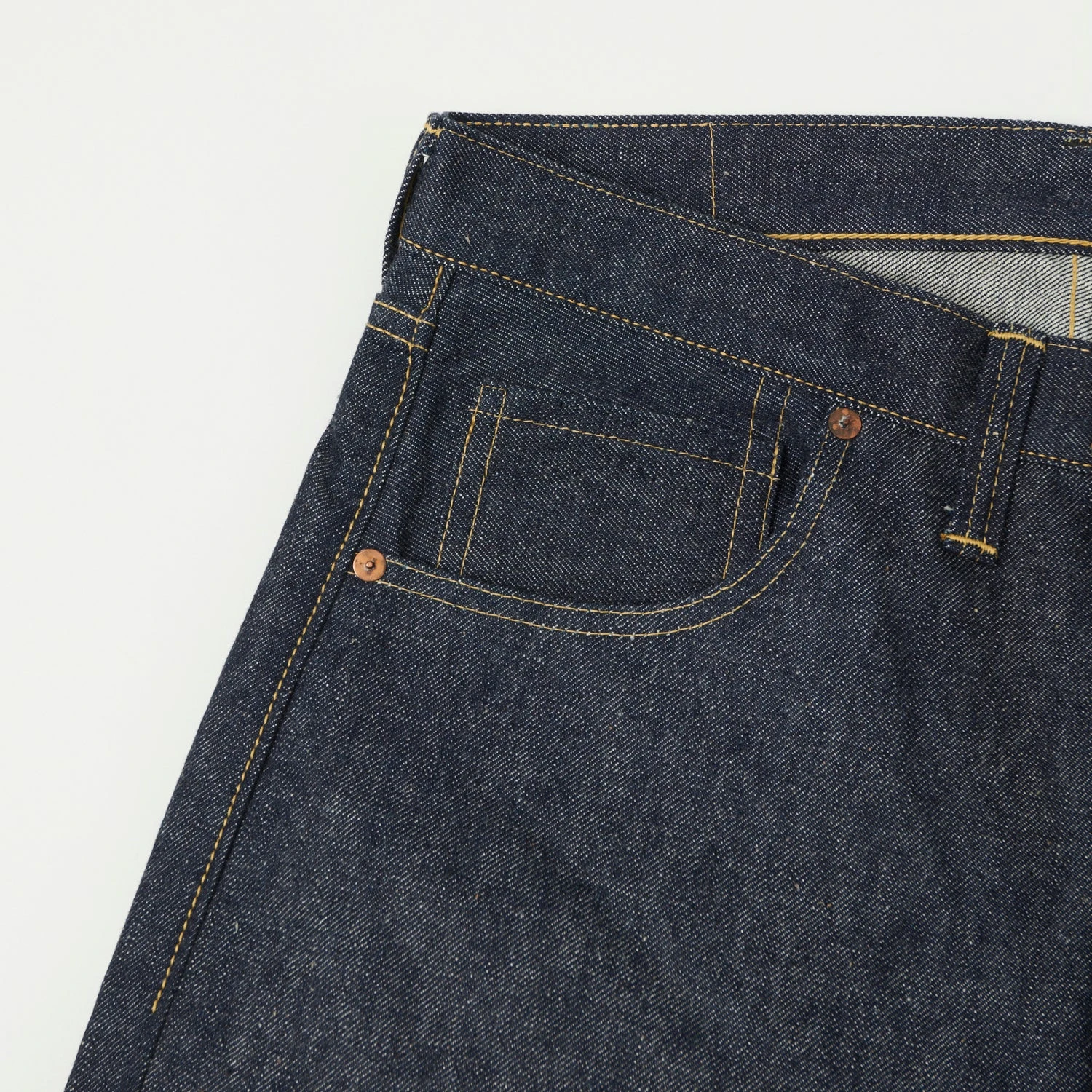 The fit is a regular straight, with comfortable mid-to-high rise, a little room in the thigh and a straight finish to the ankle. The watch pocket on this design goes unriveted, and the single stitch back pockets have the faintest outline of painted on arcuates. These features were common in the mid-1940s due to a period of intense rationing, which meant that precious materials would be sent for military production instead of civilian life. Copper core summarys have been used on this model, which has been custom branded with the brand’s logo, and a veg-tanned deerskin leather patch has been added to the waistband for authenticity. This jean looks and feels just like the real thing and has quickly become one of our favourite new arrivals.