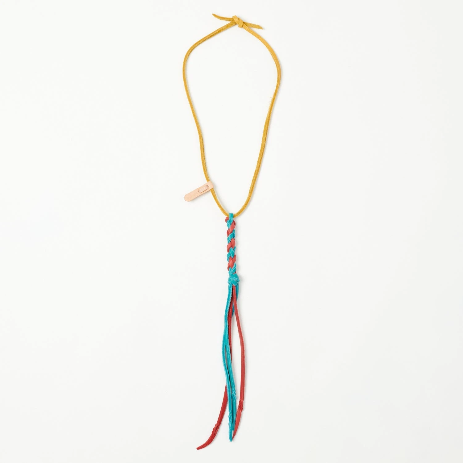 Braided using a supple 100% cowhide leather, this traditional necklace proudly displays influence from the brand’s roots. An adjustable tie has been added to the neck of this piece, while eye catching colours have been woven to create an accessory which brightens the mood of any ensemble. Wear this necklace with flat colours to help its vibrancy to breathe.